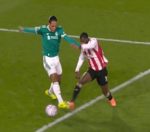 罗宾逊通过麦克风解释说,犯规实际上发生在“线上”,因此判给布伦特福德一个点球。范戴克的懊恼在蒂亚戈点球命中后进一步加剧。