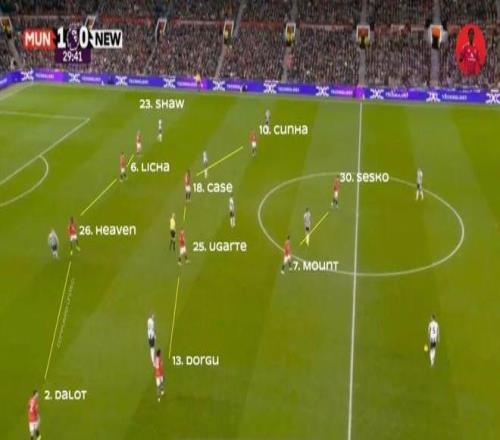 这是阿莫林执教13个月以来首次采用首发的4231阵型,卢克·肖回到左边卫位置,而帕特里克·多古则重演在意甲莱切时打右边锋的一幕,与迪奥古·达洛一起充实右侧防守。库尼亚和梅森·芒特替代受伤的布鲁诺·费尔南德斯,负责组织进攻。