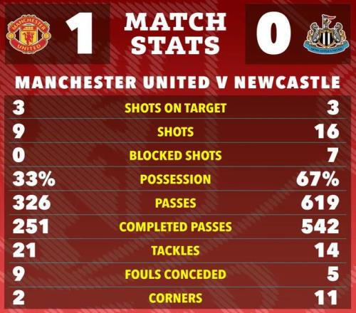 达洛浪费了另一个提前确保胜局的良机,他接到利马的长传,但一脚挑射高出横梁之外。幸运的是,这不妨碍曼联最终赢球,因为如前所述,纽卡斯尔的射门比红魔更烂。