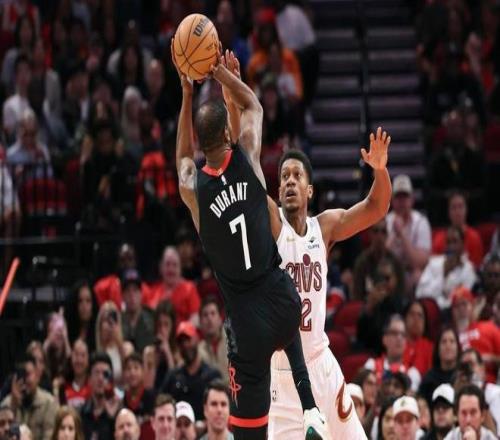 下半场比赛开始,易边再战,米切尔闪电突破抛投得手,揭开第三节比赛序幕,小史密斯的追身三分突施冷箭,还以颜色,梅里尔弧顶回应一个三分球,杜兰特标志性的飘逸跳投又咔嚓命中,米切尔借助掩护的高射炮三分同样也有,亚当斯篮下大号勾手立马予以还击,米切尔和加兰连续冲击火箭内线得手。到第三节中段,骑士彻底崩盘,陷入长达3分多钟的得分荒,被火箭打出一波攻势,分差一度来到了30分以上,三节比赛打完,火箭90-63领先骑士27分。末节决战,即便骑士找回进攻状态,但前面挖的坑实在太大,比赛时间也所剩无几。