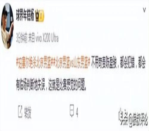 篮球记者“贾磊”发文点评:“珀塞尔绝杀了!山东队今天确实是打的更出色的那支球队,谢智杰很好的展现了自己打一号位的能力,将山东队的进攻梳理的井井有条。两支球队其实在最后时刻都犯了错误,但很显然北京队犯了更多的错误。如果说有什么疑问,就是不知道斯皮尔曼这场前面状态那么好,第四节为什么就不用了?斯皮尔曼前三节可是12中8拿了20分啊。”