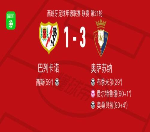 北京时间1月24日,西班牙足球甲级联赛第21轮,巴列卡诺主场对阵奥萨苏纳。布季米尔率先破门,西斯随后为巴列卡诺扳回一球。比赛临近结束时,费尔特鲁德不慎自摆乌龙,奥桑贝拉再入一球锁定胜局。最终,巴列卡诺1比3不敌奥萨苏纳。