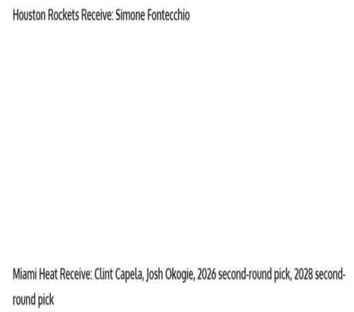 热火得到:卡佩拉+奥科吉+26年二轮签+28年二轮签。