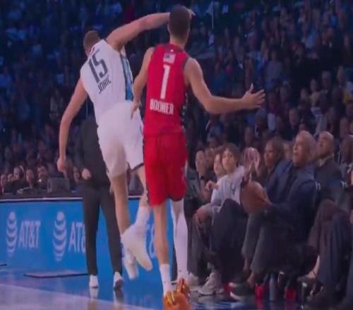 前美国总统奥巴马也现身比赛现场观战,并且在比赛中,约基奇和布克争抢球权时把球传给了奥巴马。