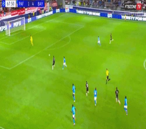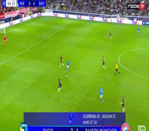 拜仁实力优势明显,从开局就压着对手猛攻。第7分钟,迪亚斯左路突破,内切之后起脚劲射,帕福斯门将飞身将球扑出。紧接着的角球攻势,奥利塞送出传中,凯恩高难度倒钩攻门,可惜击中横梁弹出。