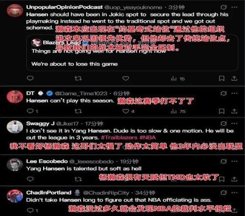 网友@NO bb:比卢普斯对得起小杨了。夏季联赛跟季前赛可不是一个档次的,给了20分钟,少些吹捧少些谩骂