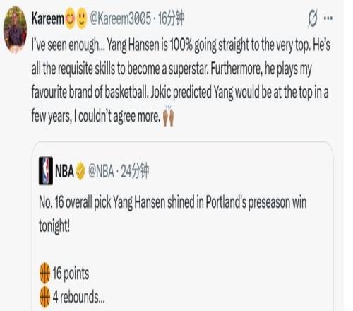 美国球迷转发NBA官方发布的杨瀚森集锦,评价杨瀚森:“我已经看够了(他的表现)……杨瀚森百分之百会直奔顶峰。他具备成为超级巨星所需的一切必要技能。此外,他打的篮球正是我最喜欢的那种风格。约基奇预测杨瀚森几年内就会达到顶尖水平,我完全赞同。”