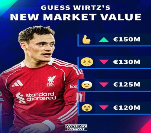 10月17日德转就将更新英超球员的身价,对此他们给目前身价1.4亿欧元的维尔茨做了预热,并且给出了四个身价选项,分别是上涨至1.5亿欧元、下跌至1.3亿欧元、下跌至1.25亿欧元以及下跌至1.2亿欧元。