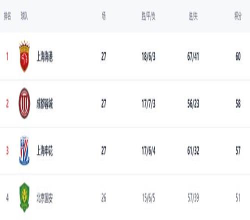27轮之后,上海海港以60分继续领跑,成都蓉城以58分排名第二位,而申花则以57分排名第三位。
