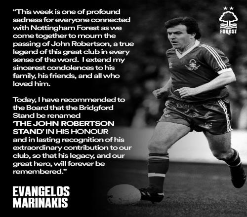 。为纪念俱乐部传奇,森林老板马里纳基斯提议用罗伯逊名字命名看台。马里纳基斯发言如下“本周对所有与诺丁汉森林相关的人而言,都是充满深切悲痛的一周——我们齐聚在此,悼念约