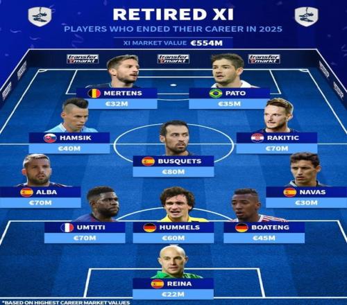 北京时间12月28日,德转列出了2025年退役球员最佳11人阵容,两位中超旧将帕托和哈姆西克上榜,其中生涯德转身价最高的球员是曾经达到8000万欧元的布斯克茨。德转列2025年退役球员